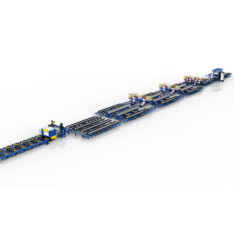 Kemudian sesuai program otomatis, Peralatan akan mengangkat pelat web, membalikkan kedua pelat flensa dan menjepit pelat web untuk awalnya membentuk bentuk H, dan kemudian diangkut ke mesin utama bersama-sama. Kemudian, perangkat yang dipasang pada mesin untuk menyelaraskan ujung web dan flensa, perangkat penekan web, perangkat penjepit H-beam, sistem kontrol otomatis dan Empat set obor las dan komponen lainnya berkoordinasi untuk bekerja sama untuk menyelesaikan perakitan H-beam dengan cepat dengan pengelasan titik.